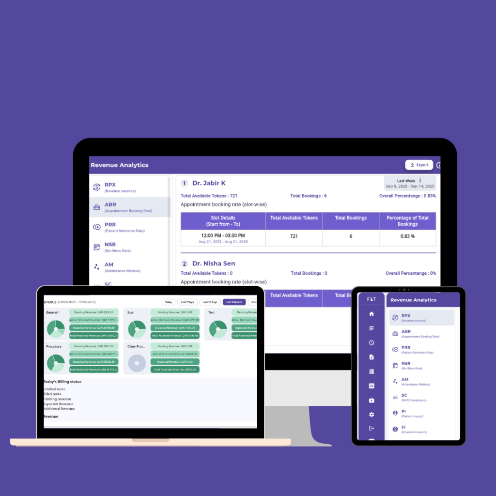 Generate detailed reports filtered by custom date ranges. Whether it’s daily, weekly, or monthly insights, Felixatouch empowers administrators to analyze performance, revenue, expenses, and patient inflow with precision.